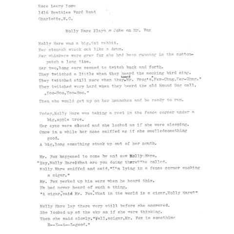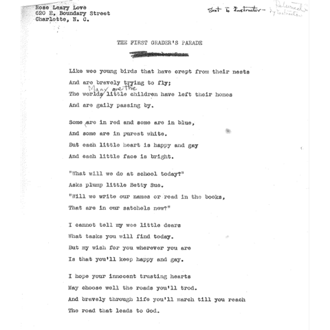 Poem by Rose Leary Love. From Rose Leary Love Papers, 1930-1994, Robinson-Spangler Carolina Room